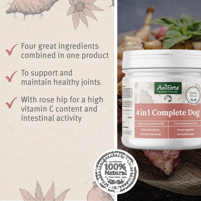 Aniforte 4 in 1 Complete for Dogs is a complementary feed for dogs made from a unique blend of pure Brewer's Yeast, Rosehip, Green-Lipped Mussel and Jerusalem Artichoke. These four high-quality raw ingredients can help support your dog’s joints, coat and skin, stomach and intestine, and immune system. Save time, money and the planet by getting these essential supplements in one product.