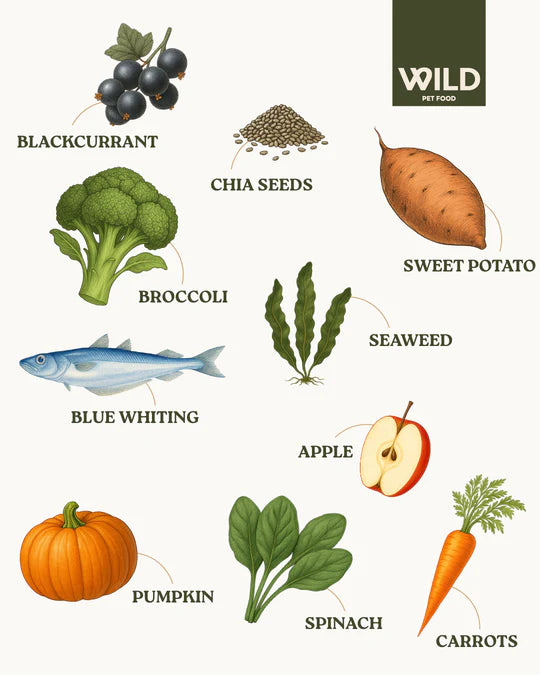 Cold-Pressed Sunflower Oil 3%, Carrot 3%, Sweet Potato 3%, Kelp Seaweed 2.5%, Spinach 2.5%, Ground Chia Seeds 2%, Pumpkin 1%, Apple 1%, Blackcurrant 1%, Herb, Botanicals & Superfood Blend 1% (Oregano 0.1%, Chicory Root 0.1%, Ginger 0.1%, Turmeric 0.1%, Black Pepper 0.1%, Echinacea Root 0.1%, Algae Omega 3 Powder 0.1%, Broccoli 0.1%, Green Lipped Mussel Powder 0.1%, Natural Probiotic (Gut Friendly Bacteria - Bacillus Velezensis) 0.0023%)